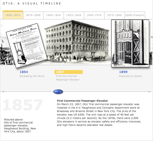 “At the age of 40, while he was cleaning up the factory, he wondered how he could get all the old debris up to the upper levels of the factory. He had heard of hoisting platforms, but these often broke, and he was unwilling to take the risks. He and his sons, who were also tinkerers, designed their own ‘safety elevator’ and tested it successfully. He initially thought so little of it he neither patented it nor requested a bonus from his superiors for it, nor did he try to sell it. After having made several sales, and after the bedstead factory declined, Otis took the opportunity to make an elevator company out of it, initially called Union Elevator Works and later Otis Brothers & Co.