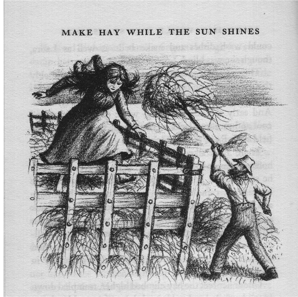 “There Pa walked beside the wagon and drove the horses between the rows of haycocks. At every haycock he stopped the horses and pitched the hay up into the hayrack. It came tumbling loosely over the high edge and Laura trampled it down. Up and down and back and forth she trampled the loose hay with all the might of her legs, while the forkfuls kept coming over and falling, and she went on trampling while the wagon jolted on to the next haycock. Then Pa pitched more hay in from the other side.
