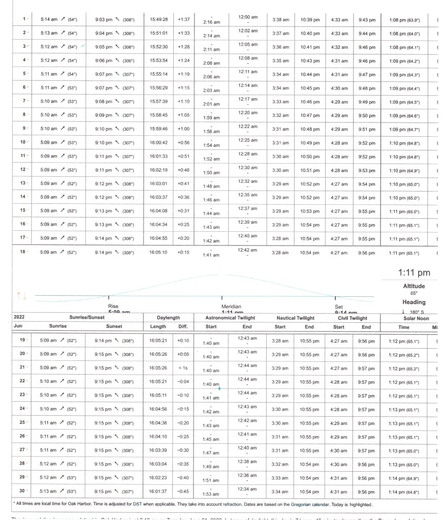 The summer solstice is the longest number of daylight hours for us. In fact the sun will not set until 9:15 p.m. with civil twilight extending until just before 10 p.m. and not fully dark until 12:45 a.m.