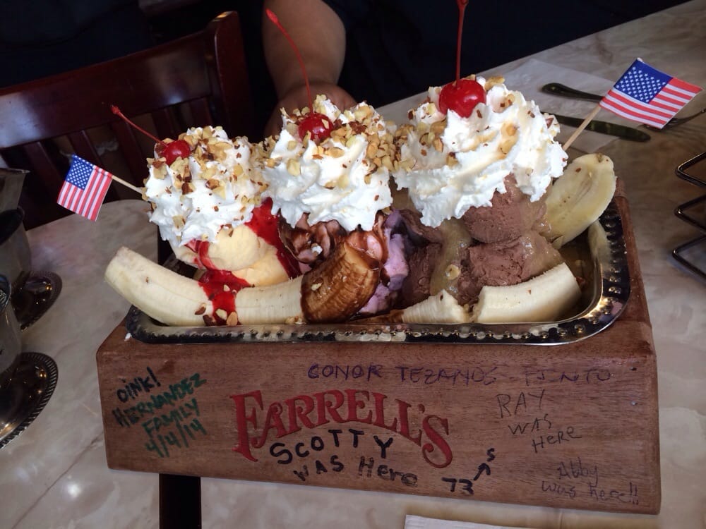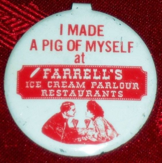 Back in my teen years a real treat was to go to Farrell’s – an ice cream and burgers restaurant which hearkened back to the days of the Soda Fountain. This was a special event for this kid from Yakima. We did not have anything nearly as cool as a Farrell’s. I looked forward to the rare expeditions to Seattle because it often meant gorging on ice cream at Farrell’s. A trip to Farrell’s was more about the experience than the food. The staff would sing happy birthday if you were so lucky to be there on your big day. Heaven help you if you ordered the ‘Pig Trough’. It featured a dozen scoops of ice cream and the rule was that YOU had to eat it all by yourself! Finish it and you were awarded a badge which said “I made of Pig of myself at Farrell’s.” The staff would parade through the restaurant with great fanfare, kazoos playing and drums pounding, to bring the trough to the person who ordered it and then do the repeat parade if that customer was able to finish it.
