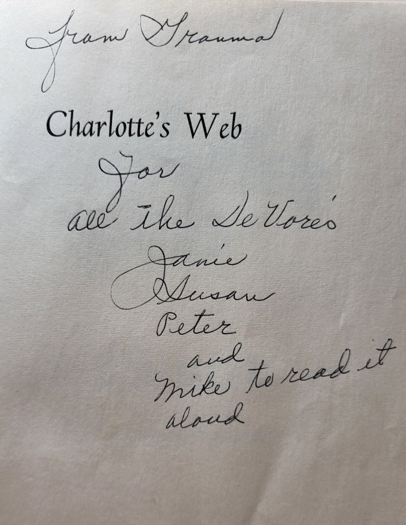 The inscription in the late 1950’s Charlotte’s Web given to me and my siblings from our Grandmother.