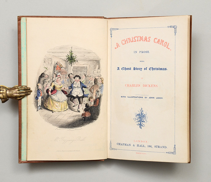 “As the result of the disagreements with Chapman and Hall over the commercial failures of Martin Chuzzlewit Dickens arranged to pay for the publishing himself, in exchange for a percentage of the profits. Production of A Christmas Carol was not without problems. The first printing contained drab olive endpapers that Dickens felt were unacceptable, and the publisher quickly replaced them with yellow endpapers, but, once replaced, those clashed with the title page, which was then redone. The final product was bound in red cloth with gilt-edged pages, completed only two days before the publication date of 19 December 1843.”