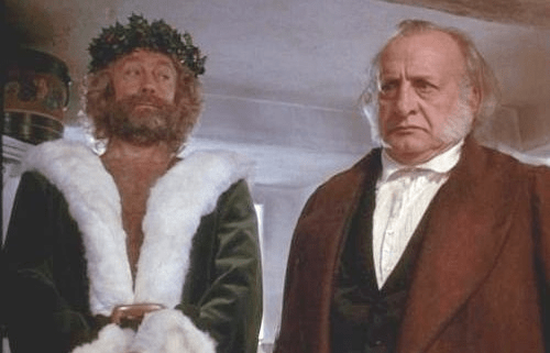 The Ghost of Christmas Present and Scrooge in the 1984 version featuring George C. Scott