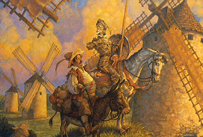 Cervantes is considered the most influential Spanish language author. His most famous work depicted here: Don Quixote.