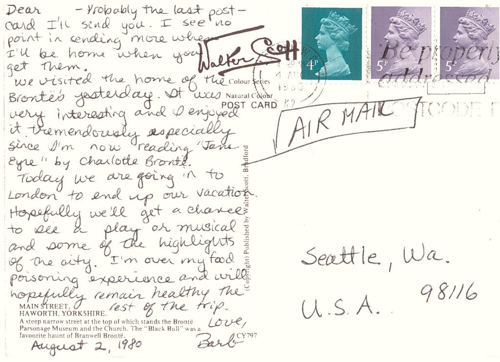 Although we spent the first day in London, the next morning we flew to Bergen, Norway, and began a multi-day bus tour of that country, ending up in Olso. From there, it was fly back to England for car touring as my dad rented a vehicle and we drove up through the countryside to Scotland. After Edinburgh, we returned to London. It was there, on August 2nd, that I write a postcard to my fiancé as follows: