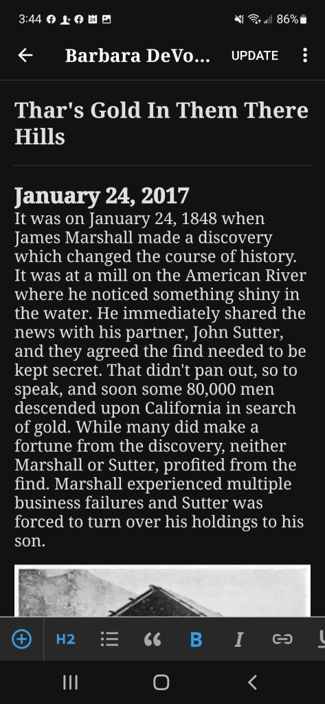 The shortest blog post is, ironically, from January 24, 2017. It was only the second post I ever wrote. The reason it’s so short is that I was still finding my blog ‘voice’ at that point. I recall looking for a topic to write about and couldn’t find anything which inspired a personal connection. So I wrote about Sutter’s Mill. I’ve never been to Sutter’s Mill. I discovered that I didn’t even reference the Infallible Wikipedia for that article. Likely the only time I haven’t. It’s a very lame article but for full transparency, here’s the link: https://barbaradevore.com/2017/01/24/thars-gold-in-them-there-hills/