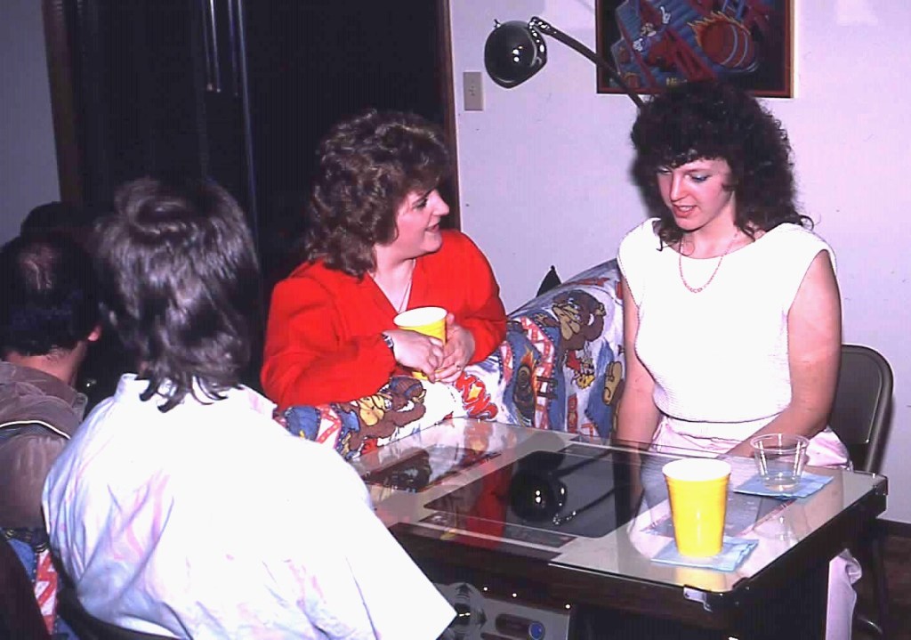 Friends at the 1987 April Fools Day party enjoying a game of Donkey Kong on our Cocktail Table game console. Note the blanket on the back of the couch and the framed DK poster.