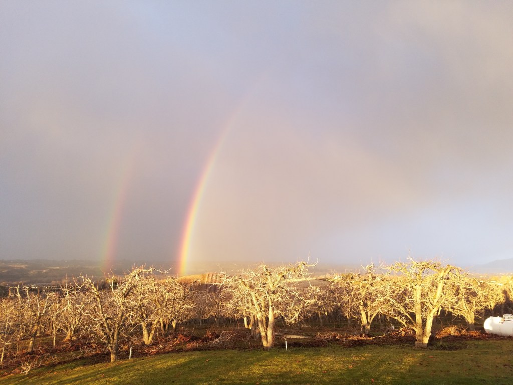 Different fruits require being harvested in certain ways. Picking cherries, it turns out, is quite the delicate operation. You must grasp the fruit at the very top of the stem where it is attached to the branch and gently twist so that the stem is removed from the branch without pulling the ‘spur’ off the tree. Then you place – never drop – the fruit into the bucket. Lather, rinse, repeat. My rough estimates are thus: a gallon is about 80 cherries. Multiply 4.5 gallons times 80 which is about 360 cherries for one bucket. For those who have never picked said cherries, it takes a long time to pick 360 cherries. Then there’s the ‘tree’. While about half of the first bucket can be picked while standing under it eventually you have to climb up a ladder – up to heights between 12 to 15 feet – while balancing your bucket of heavy fruit and reaching for the cherries.